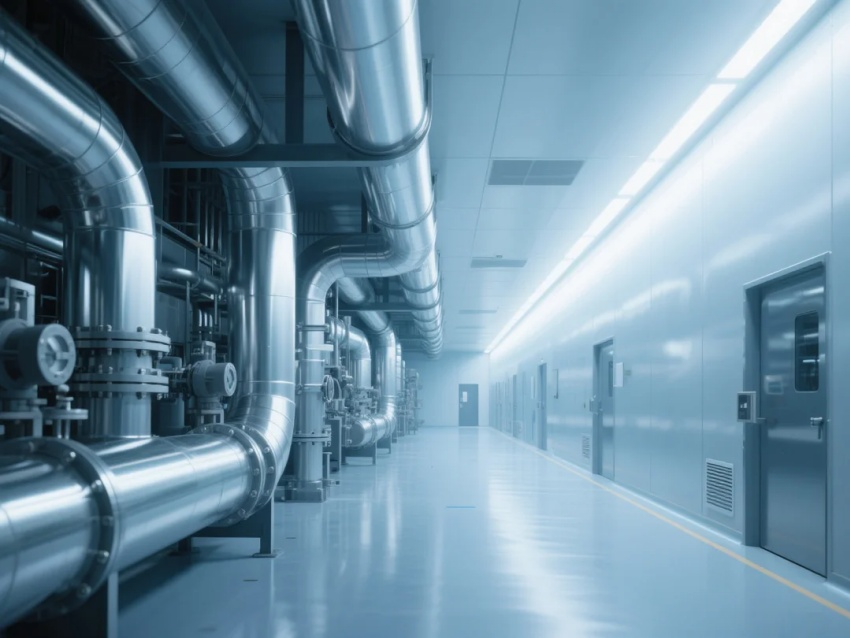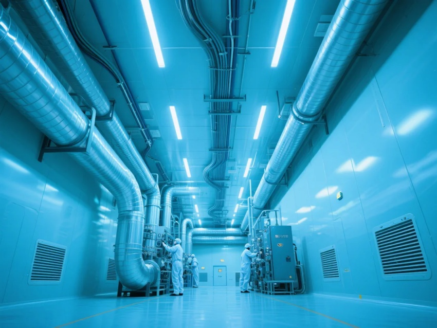 本方案嚴(yán)格遵循ISO6級(千級)潔凈標(biāo)準(zhǔn),采用模塊化潔凈室結(jié)構(gòu),以灰白色調(diào)為主,搭配防靜電高架地板與金屬壁板,打造高精度半導(dǎo)體生產(chǎn)環(huán)境。