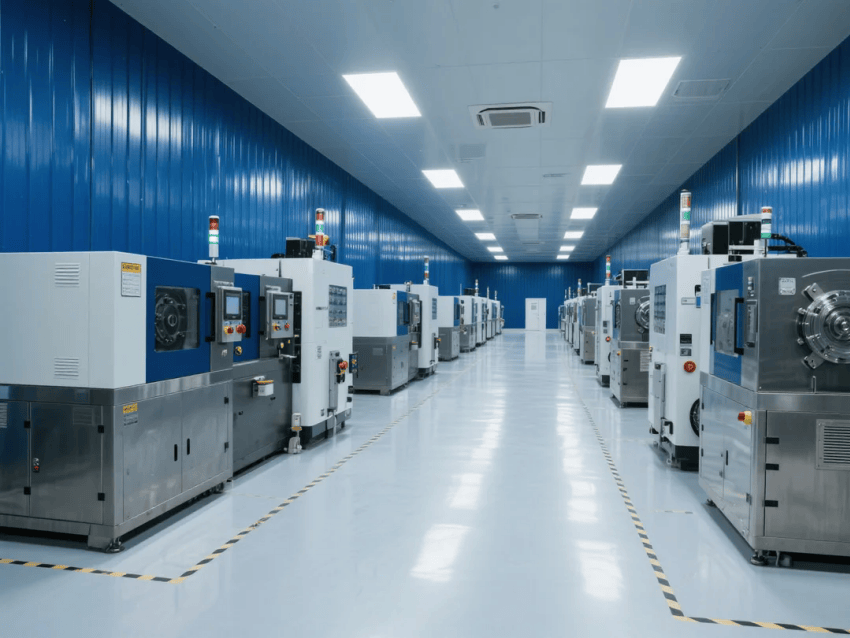 智能控制系統(tǒng)集成環(huán)境監(jiān)測、設(shè)備聯(lián)動與生產(chǎn)看板,深藍(lán)墻面上嵌裝LED數(shù)據(jù)顯示屏,實時反饋工藝參數(shù)。照明系統(tǒng)采用600x600mm潔凈平板燈,色溫5000K,重點工位增設(shè)局部補光。整體設(shè)計通過冷色調(diào)的工業(yè)美學(xué)與自動化產(chǎn)線融合,構(gòu)建高效、精準(zhǔn)的現(xiàn)代化注塑生產(chǎn)空間。