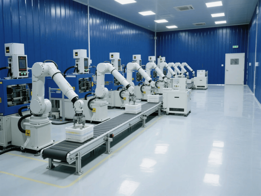 車間采用模塊化潔凈結(jié)構(gòu),50mm厚深藍(lán)抗菌彩鋼板墻體搭配圓弧收邊工藝,確保無塵死角。自動化注塑機(jī)與機(jī)械臂工作站呈流水線布局,設(shè)備區(qū)采用淺灰不銹鋼圍擋,與深藍(lán)墻體形成鮮明對比。吊頂系統(tǒng)配置FFU高效過濾單元,維持≥25次/h換氣次數(shù),氣流組織采用頂送側(cè)回模式,確保溫濕度與潔凈度穩(wěn)定。