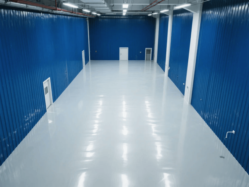 本方案以工業(yè)科技風(fēng)為設(shè)計導(dǎo)向,打造符合ISO14644-1Class7標(biāo)準(zhǔn)的智能化注塑生產(chǎn)環(huán)境。空間主體采用深藍(lán)色彩鋼板墻體與淺灰防靜電環(huán)氧自流平地坪,形成冷峻而富有科技感的視覺層次。地面系統(tǒng)電阻值穩(wěn)定控制在10^6~10^9Ω,兼具防靜電與耐磨特性,滿足精密注塑工藝需求。