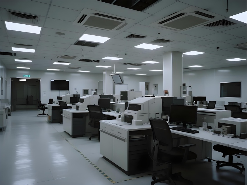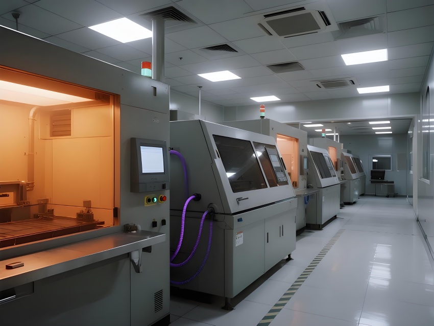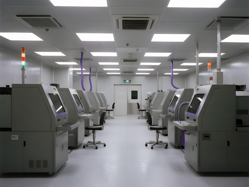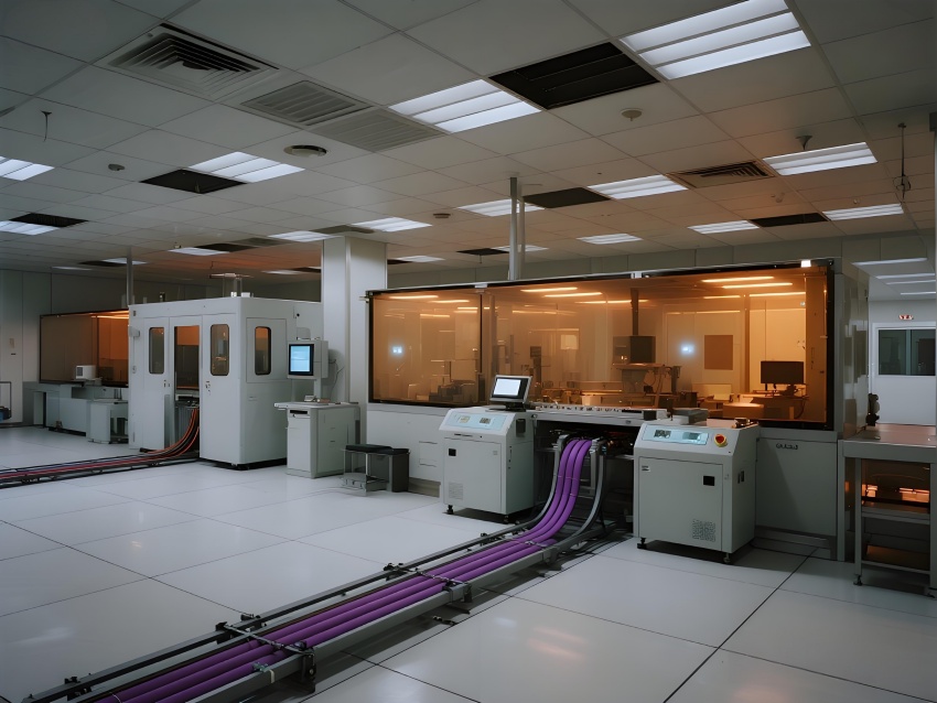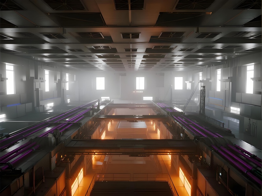 本芯片廠采用"硅基未來主義"設(shè)計風格,將納米級制造的精密感轉(zhuǎn)化為宏大的工業(yè)美學??臻g以鈦銀與深空灰為主色調(diào),光刻區(qū)的琥珀色防霧照明與蝕刻區(qū)的冷紫工藝氣體管道形成科技光譜。高架地板下的藍色氣流指示燈模擬集成電路紋路,天花板的矩陣式FFU單元如晶圓陣列般規(guī)整。透明設(shè)備艙內(nèi)機械臂的精準運動軌跡,與墻面懸浮的晶圓生產(chǎn)數(shù)據(jù)流構(gòu)成動態(tài)敘事。防靜電涂層的金屬質(zhì)感表面反射出潔凈室的無限縱深感,關(guān)鍵區(qū)的紅色激光定位光幕則強化半導(dǎo)體制造的危險與精確。通過嚴格的功能色彩編碼(黃-光刻/紫-蝕刻/藍-檢測)和極簡的無縫設(shè)計,在滿足ISO14644Class1標準的同時,塑造出如同微觀芯片放大至建筑尺度的震撼視覺隱喻。