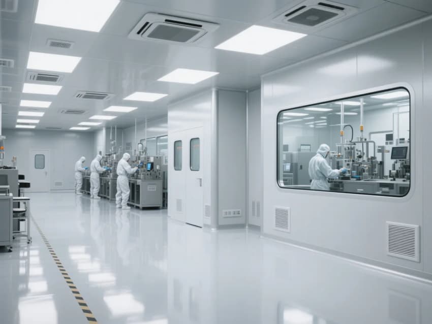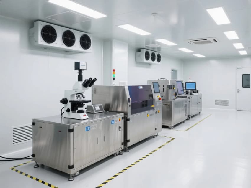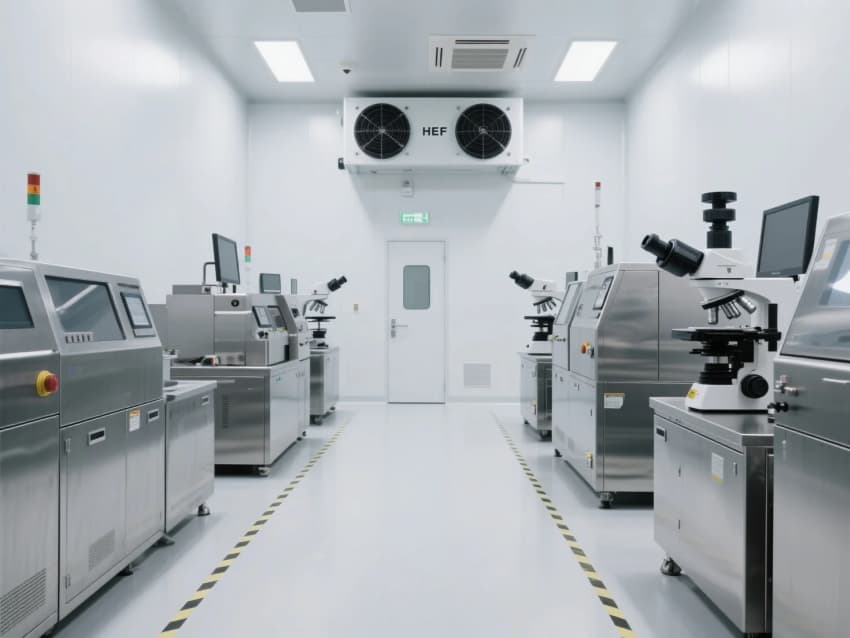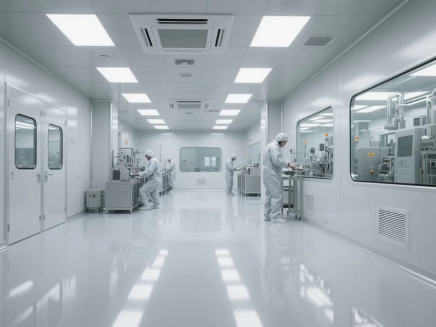 本方案采用"科技極簡主義"風格,以ISO 5級(萬級)潔凈標準為核心??臻g設(shè)計強調(diào)線性流動感,灰白主色調(diào)搭配防靜電環(huán)氧樹脂地坪,墻面采用抗菌彩鋼板。頂棚網(wǎng)格化FFU送風單元配合側(cè)墻回風,形成垂直層流。功能分區(qū)明確,包含更衣緩沖間(Class 7)、核心生產(chǎn)區(qū)(Class 5)、設(shè)備維護通道。智能控制系統(tǒng)集成溫濕度(22±1℃/45±5%)、壓差(+10Pa)、粒子監(jiān)測顯示。創(chuàng)新采用LED黃光照明減少光致氧化,設(shè)備基座增設(shè)主動減震系統(tǒng)。設(shè)計融合人機工程學,防靜電設(shè)施覆蓋率100%,通過藍色光帶引導潔凈動線,實現(xiàn)功能性與未來感的完美平衡。