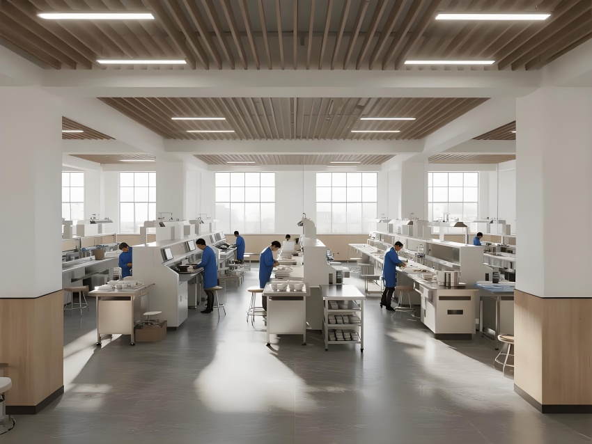 本餐具制品車間設(shè)計以現(xiàn)代簡約工業(yè)風(fēng)為核心,融合高效生產(chǎn)與視覺舒適性。色調(diào)以純凈白(墻面)、淺木色(倉儲柜)和不銹鋼銀灰(設(shè)備)為主,營造清爽專業(yè)的氛圍。