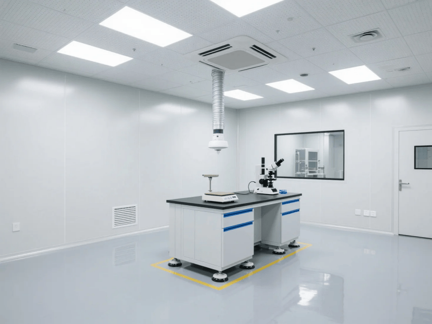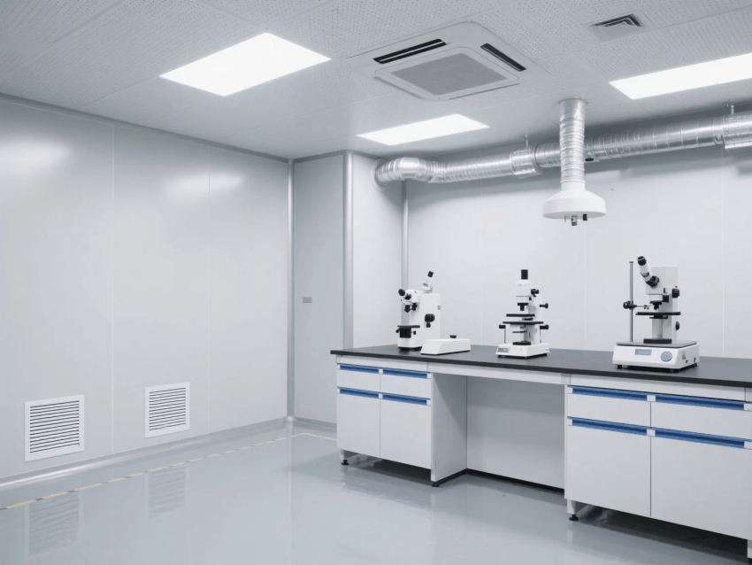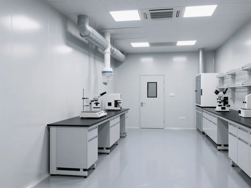 本方案采用高級灰與純白作為主色調(diào),打造嚴謹專業(yè)的實驗環(huán)境。墻面選用50mm厚聚氨酯保溫彩鋼板,表面覆有抗菌涂層,接縫處采用無縫焊接工藝處理。地面鋪設2mm厚環(huán)氧自流平地坪,具有優(yōu)異的耐化學腐蝕性能,灰白相間的分區(qū)標識既美觀又實用。