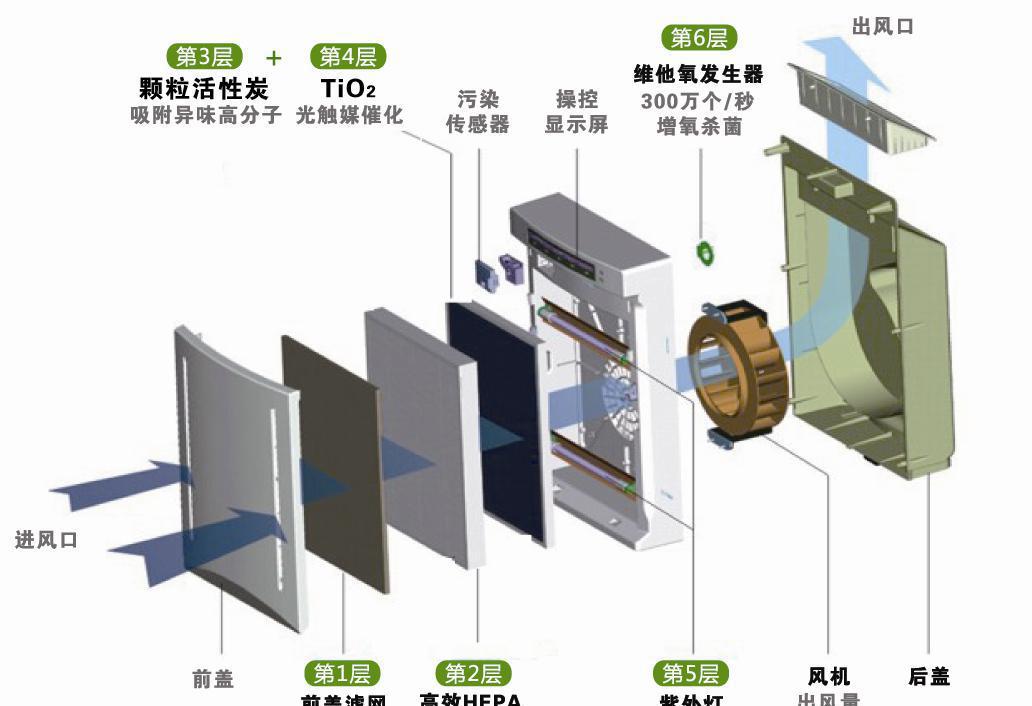 A、空氣凈化器:只能吸附空氣中灰塵等顆粒物,無(wú)法消除有害分子,即使反復(fù)處理,效果依然很差。