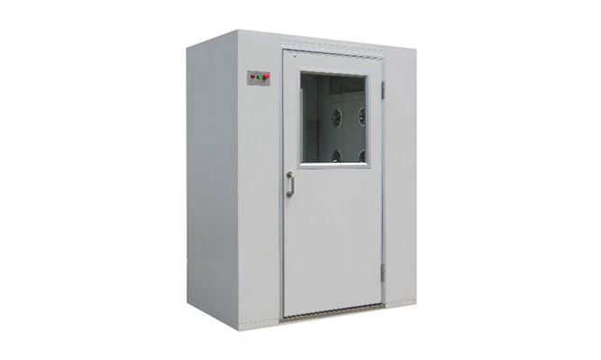 風(fēng)淋室是人員進(jìn)出潔凈室所必需的通道,并同時(shí)起到氣閘室密閉潔凈室的作用。為了減少由于人員進(jìn)出所帶來的大量塵埃粒子,經(jīng)高效過濾器過濾后的潔凈氣流由箱體兩側(cè)可旋轉(zhuǎn)噴嘴噴射至人/貨表面,有效而迅速清除塵埃粒子,清除后的塵埃粒子再由初、高效過濾器過濾后重新循環(huán)到風(fēng)淋區(qū)域內(nèi)。為了達(dá)到吹淋的最佳效果,風(fēng)淋室設(shè)計(jì)的噴嘴出風(fēng)口風(fēng)速能達(dá)到18-22m/s以上,吹到人身上的風(fēng)速最低18m/s,出廠的初始風(fēng)淋時(shí)間設(shè)置為10秒。