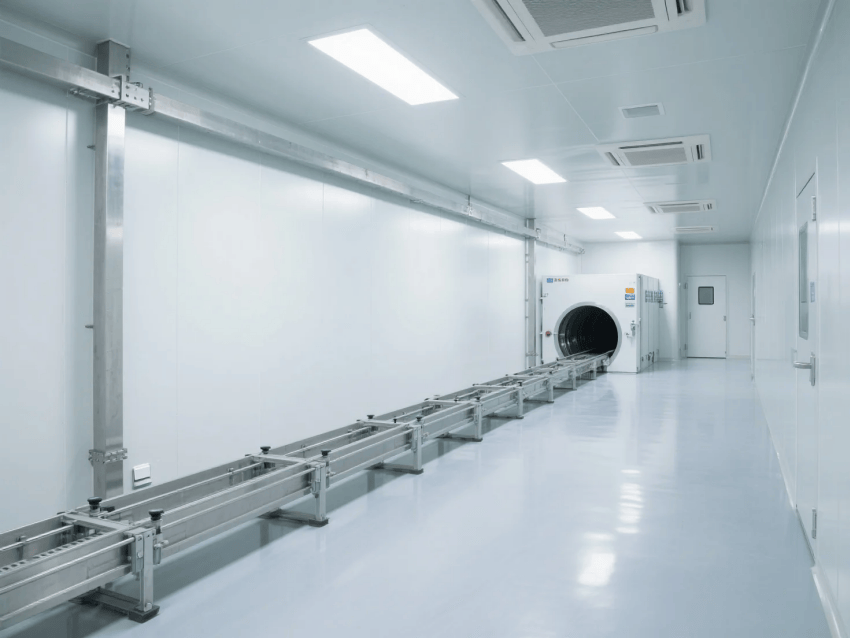 天花板系統(tǒng)多采用輕鋼龍骨搭配潔凈板吊頂,所有穿線(xiàn)孔需用密封膠封閉。燈具應(yīng)選用嵌入式潔凈燈具,與吊頂平齊安裝。對(duì)于萬(wàn)級(jí)以上潔凈車(chē)間,建議采用FFU(風(fēng)機(jī)過(guò)濾單元)滿(mǎn)布方案,每個(gè)FFU單元覆蓋面積不宜超過(guò)4㎡。