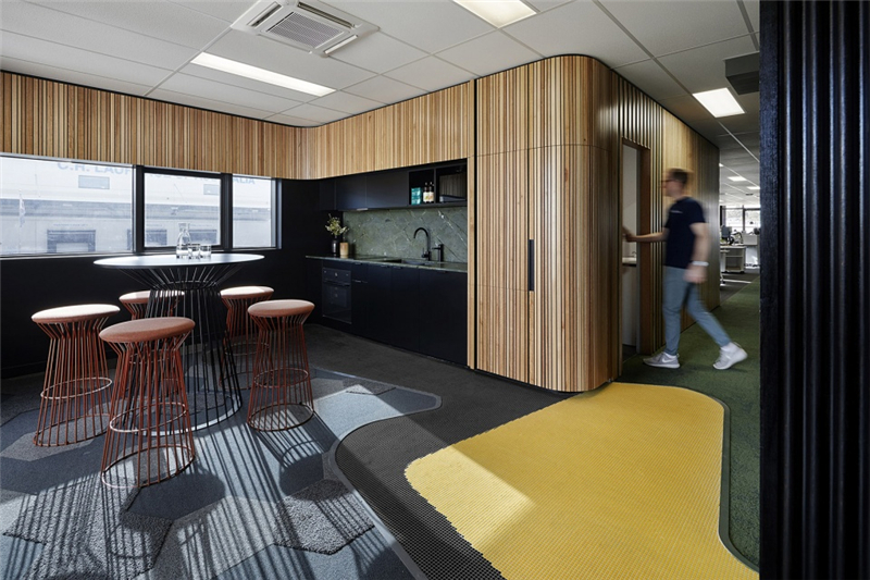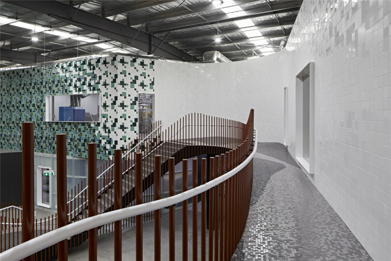 多彩的線條從附近的自然保護區(qū)一直延伸到位于生產(chǎn)區(qū)核心地帶的巨型壁畫上,吸引著員工和參觀工廠的訪客。產(chǎn)自本地的澳洲硬木和紋理豐富的墻面從外部景觀“流進”室內(nèi),在自然光線的配合下營造出富有生機的氛圍。