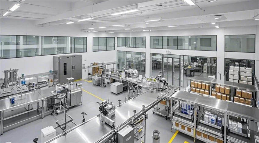 2000平方米化妝品車間,現(xiàn)代潔凈風(fēng)格。車間分為生產(chǎn)區(qū)、包裝區(qū)、原料存儲區(qū)和辦公區(qū)。生產(chǎn)區(qū)占50%,包裝區(qū)占30%,原料存儲區(qū)占10%,辦公區(qū)占10%。生產(chǎn)區(qū):防靜電環(huán)氧地坪(淺灰色),白色彩鋼板墻面和天花板,頂部高效過濾器(HEPA),不銹鋼工作臺,設(shè)備排列整齊。包裝區(qū):自動化包裝流水線,地面為防靜電PVC地板(淺色)。原料存儲區(qū):貨架整齊,溫濕度控制。辦公區(qū):玻璃隔斷,現(xiàn)代簡約辦公桌。整體色彩:白色、淺灰色、淺綠色點綴。