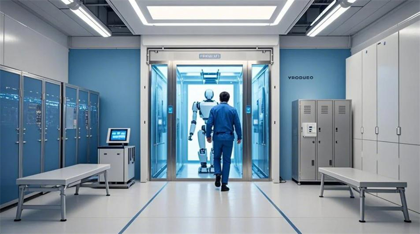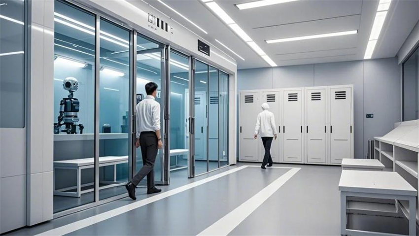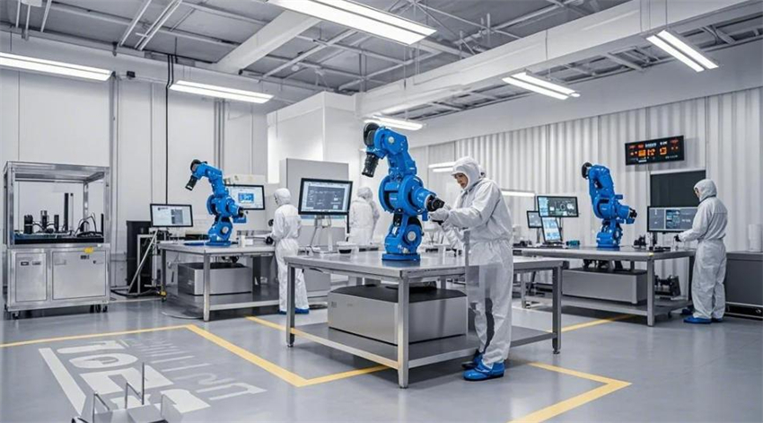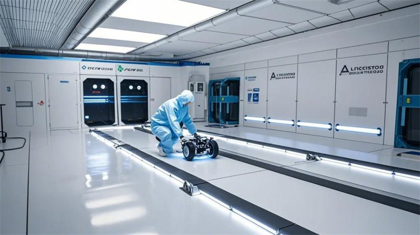 機(jī)械人研發(fā)實(shí)驗(yàn)室,未來科技風(fēng)格。實(shí)驗(yàn)室分為研發(fā)區(qū)、測(cè)試區(qū)、裝配區(qū)和辦公區(qū)。研發(fā)區(qū)占50%,測(cè)試區(qū)占30%,裝配區(qū)占10%,辦公區(qū)占10%。研發(fā)區(qū):防靜電環(huán)氧地坪(淺灰色),白色彩鋼板墻面和天花板,頂部高效過濾器(HEPA),不銹鋼工作臺(tái),機(jī)械人原型和3D打印機(jī)排列整齊。測(cè)試區(qū):機(jī)械人測(cè)試平臺(tái),地面為防靜電PVC地板(淺色)。裝配區(qū):工具架整齊,機(jī)械人部件分類存放。辦公區(qū):玻璃隔斷,現(xiàn)代簡約辦公桌。整體色彩:白色、淺灰色、科技藍(lán)點(diǎn)綴。
