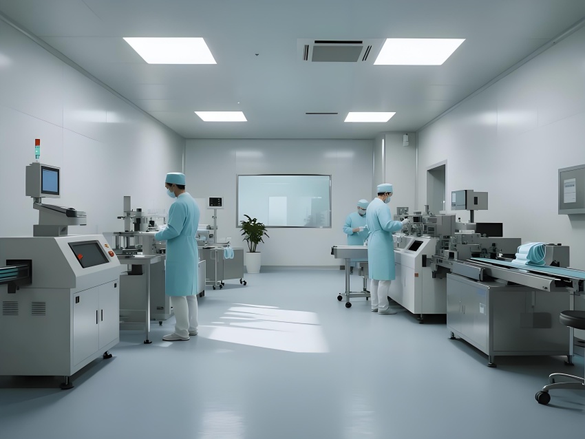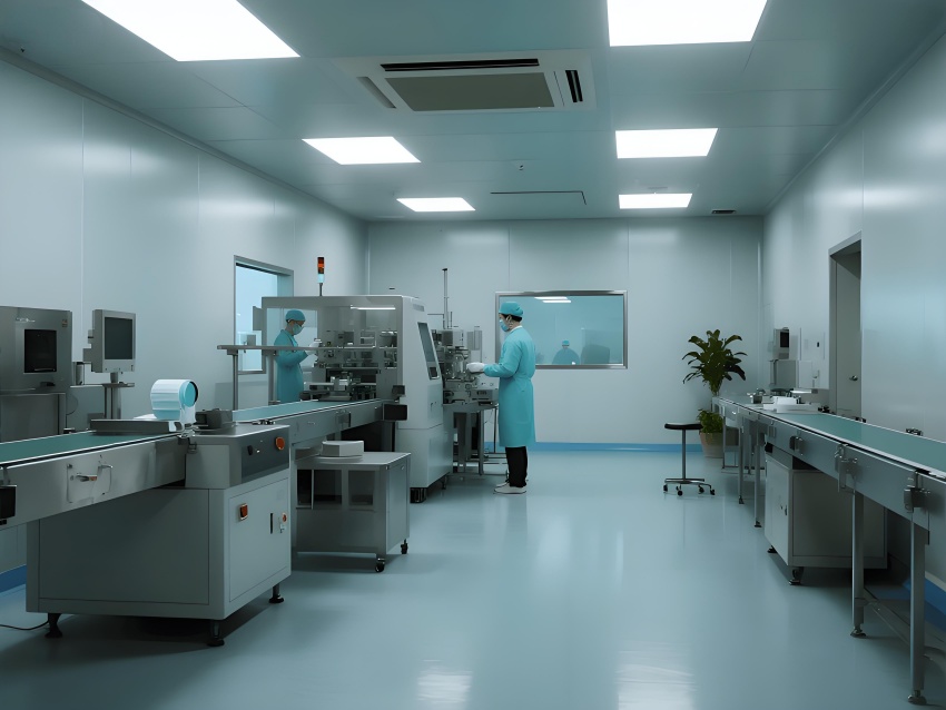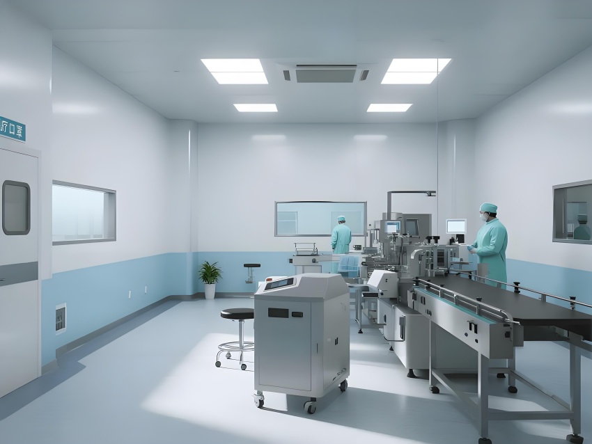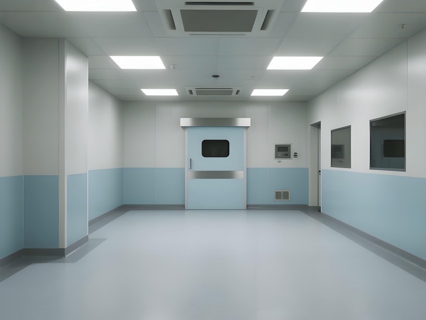 地面采用防靜電環(huán)氧自流平,耐磨無(wú)縫隙且易清潔;墻面為50mm厚抗菌彩鋼板,圓弧角處理避免積塵;頂面配置一體化鋁扣板吊頂,內(nèi)置FFU空氣過(guò)濾單元,與LED平板燈形成均勻照明。