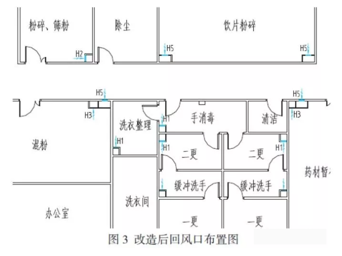 系統(tǒng)自調(diào)試階段就陷入麻煩,壓差調(diào)不正確,要不混粉、飲片粉碎等回不了風(fēng),要不潔凈走廊保證不了+15Pa 的正壓,二更和緩沖洗手出于同一壓力。施工單位用阻塞混粉等低壓力房間的回風(fēng)口、關(guān)小其送風(fēng)口的方法終于調(diào)試壓力成功,交付使用。